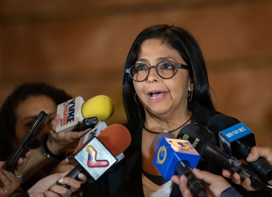 Venezuelan Vice President Delcy Rodriguez speaks with media representatives in Caracas, Venezuela, on February 8, 2020.(Xinhua/Marcos Salgado)
