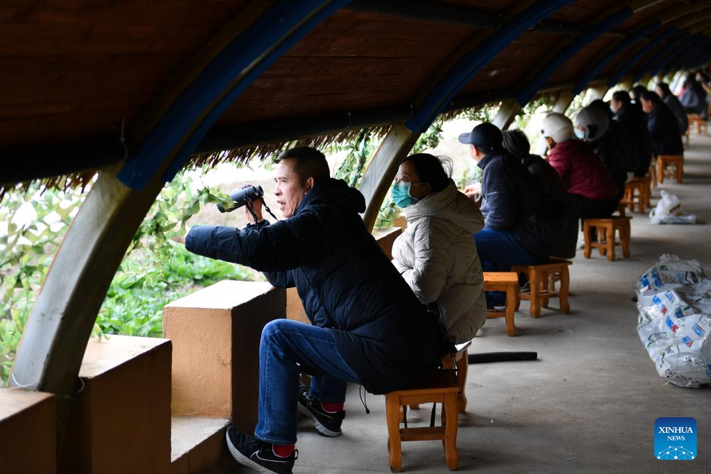 Visitors watch migratory birds at the Donggu Lake in Yueyang City, central China's Hunan Province, Dec. 20, 2025.(Xinhua/Chen Zhenhai)