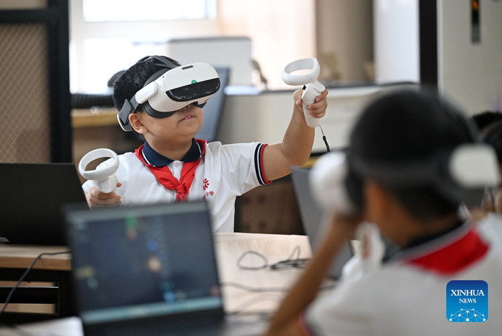 Students experience VR equipment at an AI experience center of a primary school in north China's Tianjin, Sept. 4, 2025. (Xinhua/Zhao Zishuo)