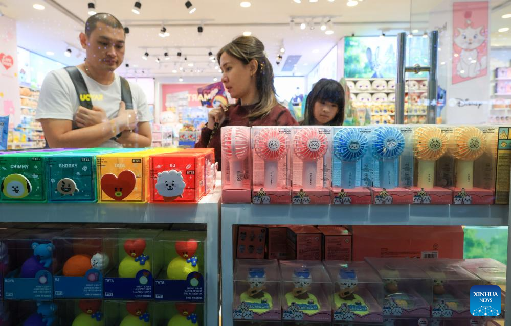 This photo shows Sanrio-themed products at Guangzhou Moetch Cultural & Creative Co., Ltd. in Guangzhou, south China's Guangdong Province, Oct. 28, 2025.