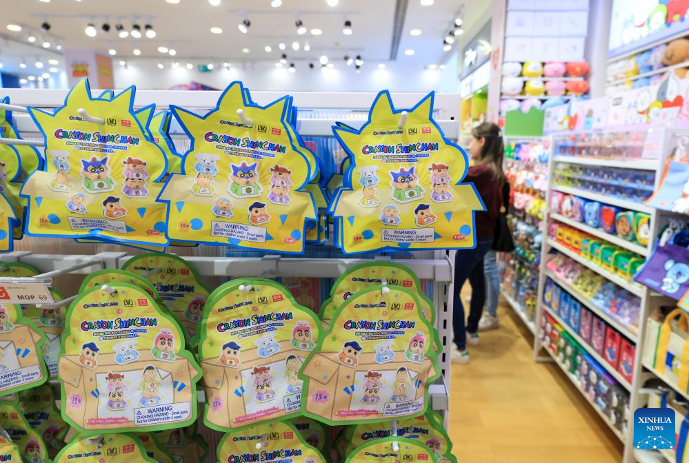 This photo shows Sanrio-themed blind boxes made by Guangzhou Moetch Cultural & Creative Co., Ltd. at a Don Don Donki store in Macao, south China, Dec. 14, 2025.