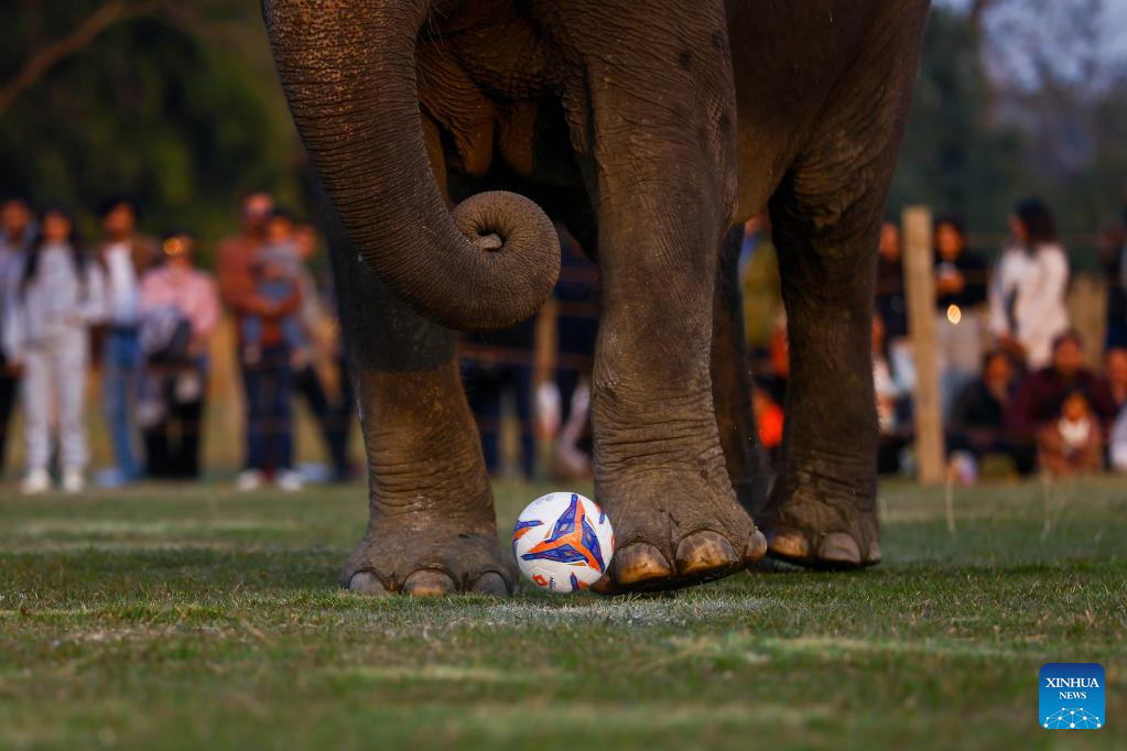 An elephant shoots a ball during a football game at the 19th Elephant and Tourism Festival in Chitwan, Nepal, Dec. 26, 2025. The event aims to bring human closer with elephants, encourage wildlife protection and conservation, and promote tourism in the region. (Photo by Sulav Shrestha/Xinhua)