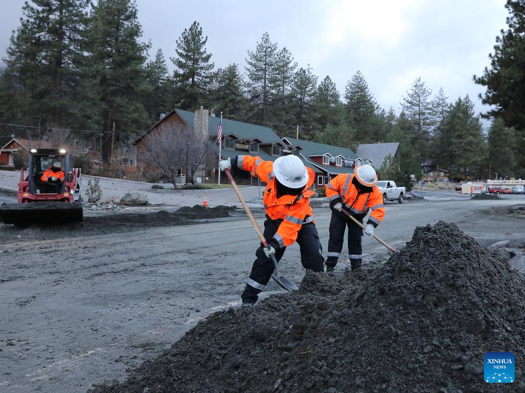 Workers prepare for another upcoming winter storm in Wrightwood, San Bernardino County, California, the United States, Dec. 25, 2025. Powerful winter storms have left at least four people dead and caused widespread damage across the U.S. state of California over the Christmas holiday week. (Photo by Qiu Chen/Xinha)
