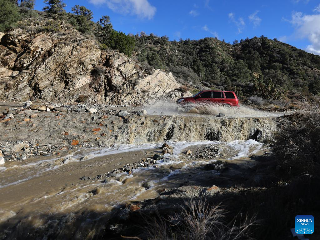 A vehicle runs on a waterlogged road near Wrightwood, San Bernardino County, California, the United States, Dec. 25, 2025. Powerful winter storms have left at least four people dead and caused widespread damage across the U.S. state of California over the Christmas holiday week. (Photo by Qiu Chen/Xinha)