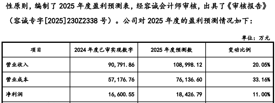 业绩最能说明问题。公开数据显示,2023年和2024年固德电材的营收、净利都保持了较快增长,营业收入同比增速分别为37%和39.48%,归母净利润同比更是高达56.87%和70.93%,招股书还披露,2025年预计全年营业收入增速仍将保持在20.05%、达10.9亿元,归母净利润也将增至1.77亿元。