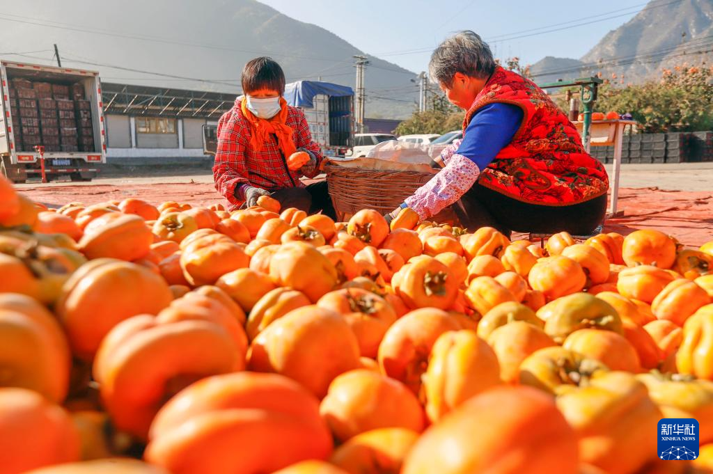 11月1日,河北省遵化市娘娘庄镇芦各寨西山村农民在场院挑选柿子。