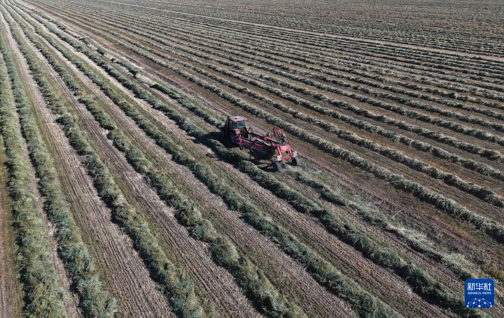 11月1日,工人驾驶拖拉机在甘肃山丹马场二场田间翻晒燕麦草(无人机照片)。