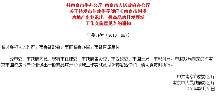 導讀 9月1日,南京市政府出臺《關于市、區(qū)屬國有獨資、控股(參股)企業(yè)從一般商品房地產(chǎn)領域退出的實施意見》,進一步明確了18家市屬國有全資及控股房地產(chǎn)企業(yè)、15項市屬國有參股房地產(chǎn)企業(yè)股權須于2013年底前完成退出,并明確一“關”三“轉”的退出機制。9月3日傍晚7點多,南京33家市屬國企名單出爐。 …[詳細]