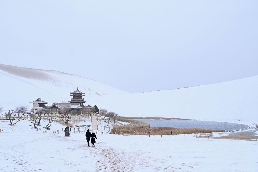 游客在甘肃省敦煌市鸣沙山月牙泉景区骑骆驼观赏雪景。新华社发(张晓亮 摄)