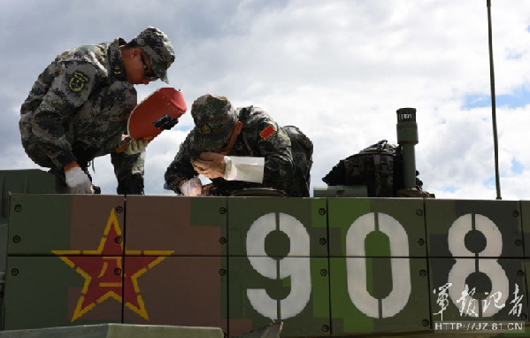 ????Chinese soldiers maintain a Type 96A tank before participating in Russia's International Army Games 2015. All the 12 troop delegations from the Chinese PLA to participate in Russia's International Army Games 2015, which is also known as the "Tank Biathlon ", have arrived at the their training grounds in Russia on July 24, local time. (english.chinamil.com.cn)