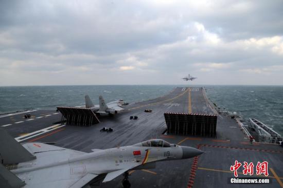 資料圖:2016年12月23日,在黃海某海空域,多批次殲-15艦載戰(zhàn)斗機(jī)從遼寧艦飛行甲板起飛升空,開展了空中加受油、空中對(duì)抗等多項(xiàng)訓(xùn)練任務(wù)。 中新社發(fā) 莫小亮 攝