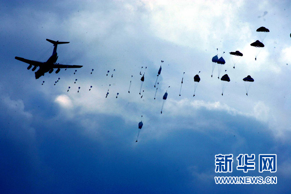 2005年8月24日,參加“和平使命-2005”中俄聯(lián)合軍事演習第三階段兩棲登陸作戰(zhàn)實兵課目演練的中國空降兵部隊在實施傘降。新華社記者 查春明 攝