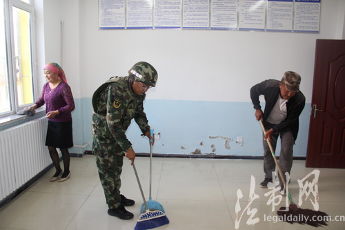 圖為“親戚”們在主動為官兵打掃警務(wù)室衛(wèi)生