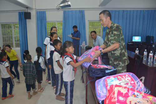 圖為官兵正將捐贈的書包遞交到學(xué)生手中