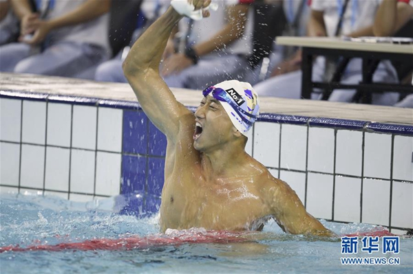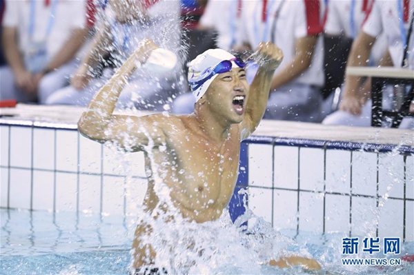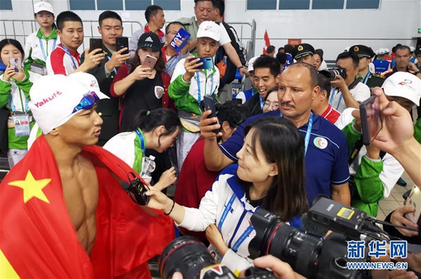 走出泳池,張政成了場上的“明星”,和幾個隊友擁抱擊掌后,便立刻被眾人圍在中間。現(xiàn)場觀眾和其他運動員紛紛向他表示祝賀,人群中不時有人歡呼著“世界紀錄!世界紀錄!”。隨后,激動的張政披著國旗,在泳池邊跟家人、朋友合影,定格了這難忘的一刻。