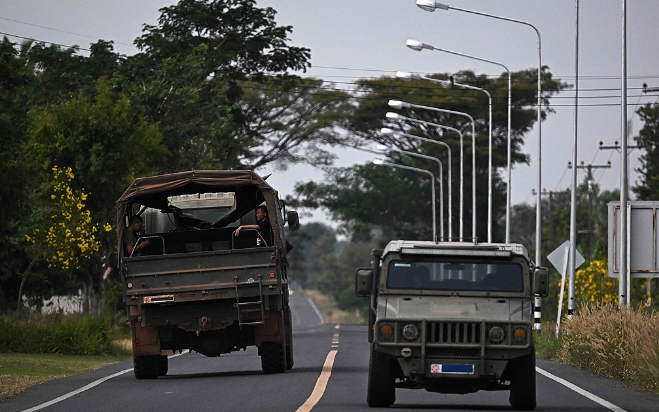 12月11日,泰柬边境冲突持续,泰国军车停靠在道路上。(视觉中国)