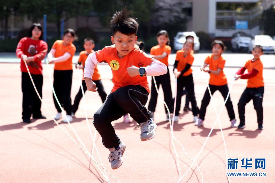 3月23日,在合肥市大通路小學新海校區(qū),學生在大課間練習花樣跳繩。