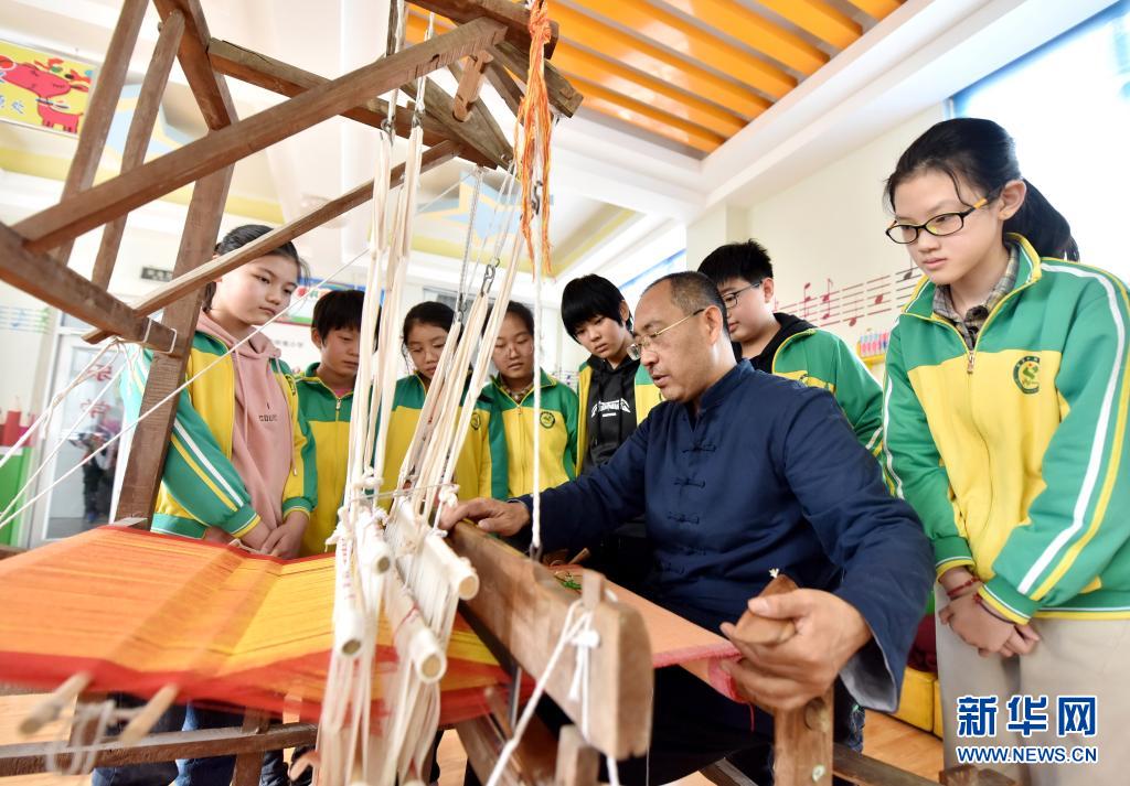 4月7日,威縣土布紡織技藝傳承人高慶海在威縣第四小學(xué)向?qū)W生演示老粗布紡織技藝。近年來(lái),河北省邢臺(tái)市威縣積極開(kāi)展“非遺傳承進(jìn)校園”活動(dòng),將當(dāng)?shù)靥厣沁z項(xiàng)目引入學(xué)校課堂,讓學(xué)生近距離感受民間傳統(tǒng)技藝的魅力,促進(jìn)非遺文化的保護(hù)和傳承。新華社記者 朱旭東 攝