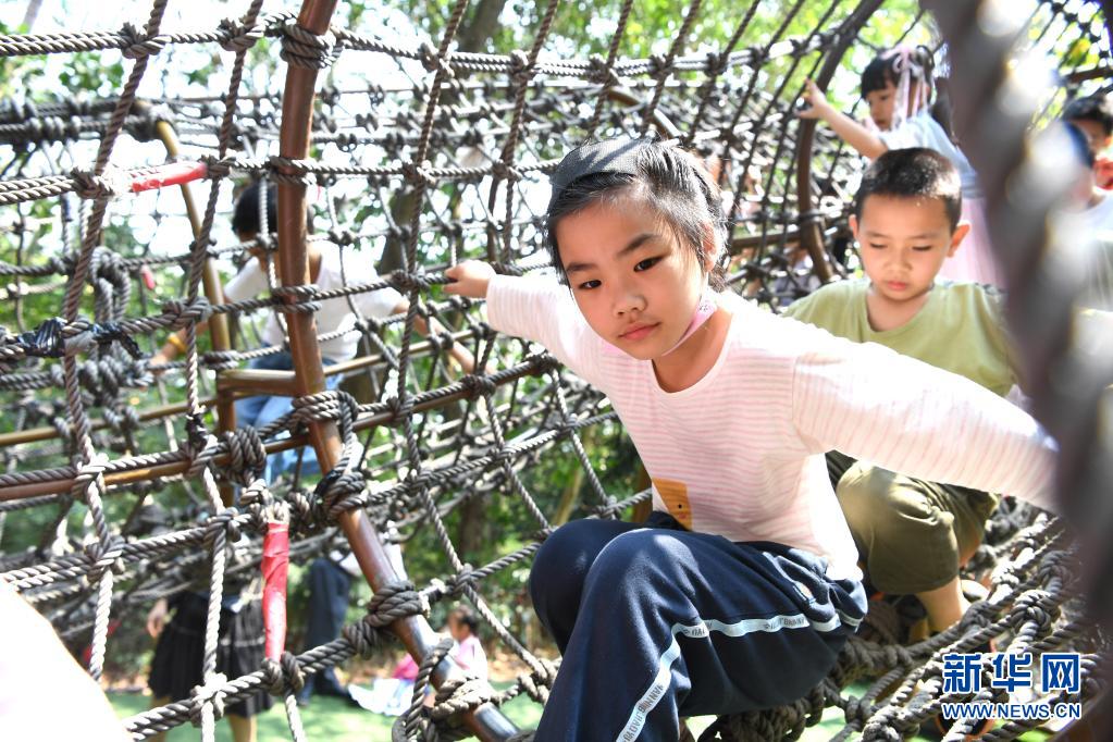 5月1日,孩子們?cè)趶V西南寧市青秀山風(fēng)景區(qū)陸地拓展競(jìng)技樂(lè)園玩耍。