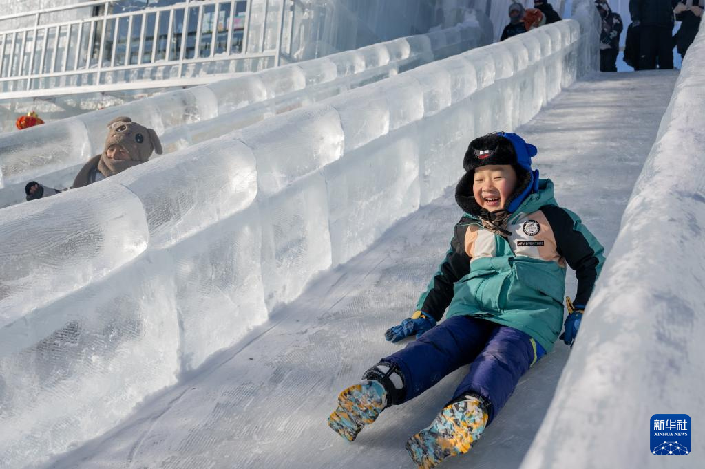 12月21日,一名市民带着孩子在冰雪那达慕开幕式上玩耍。