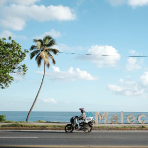 12月2日,在多米尼加圣多明各海边,市民骑摩托车经过海滨大道。