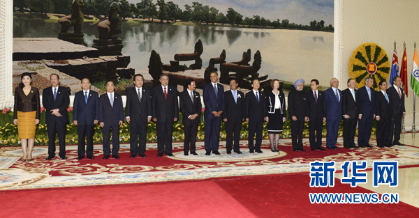 ??? 11月20日,第七屆東亞峰會(huì)在柬埔寨金邊舉行。中國(guó)國(guó)務(wù)院總理溫家寶與東亞峰會(huì)其他成員國(guó)領(lǐng)導(dǎo)人共同出席。這是與會(huì)領(lǐng)導(dǎo)人在會(huì)前合影。新華社記者 張鐸 攝
