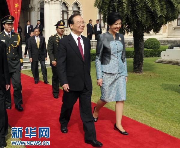 11月21日,中國國務(wù)院總理溫家寶在曼谷出席泰國總理英拉舉行的歡迎儀式。 新華社記者張鐸攝