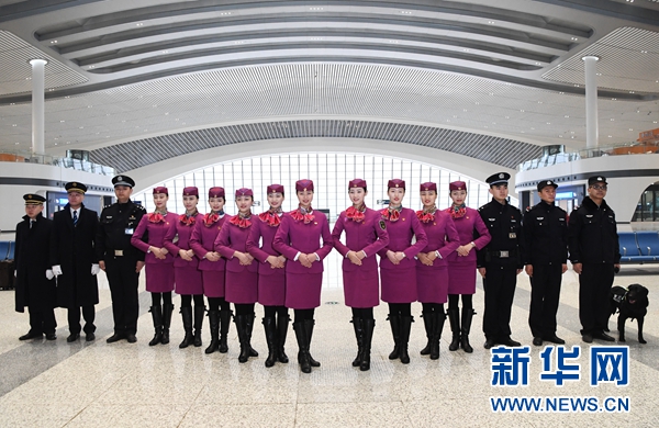 1月16日,擔(dān)任渝貴鐵路首發(fā)列車值乘工作的司機(jī)、乘務(wù)員、乘警等在重慶西站亮相。 新華社記者 王全超 攝