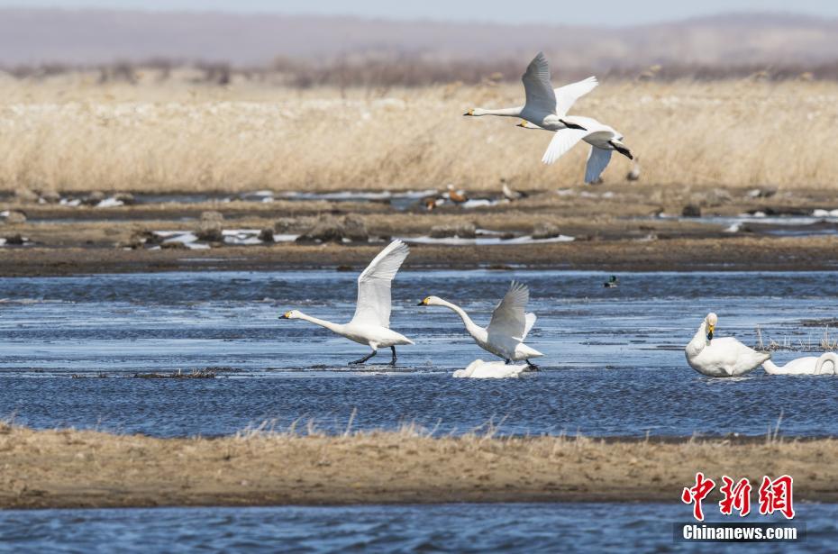 3月20日,天鵝在湖面上嬉戲。日前,內(nèi)蒙古自治區(qū)呼倫貝爾市陳巴爾虎旗陸續(xù)迎來大量北歸天鵝。據(jù)了解,每年四月份,成群的天鵝從中國南方遷徙到呼倫貝爾產(chǎn)卵繁殖,而今年三月中旬起,陳巴爾虎旗境內(nèi)便迎來大量回歸天鵝,實(shí)屬罕見。中新社記者 武軍 攝
