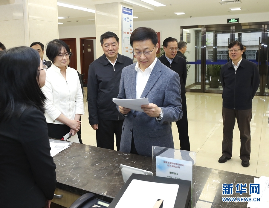 4月3日,中共中央政治局常委、國(guó)務(wù)院副總理韓正到國(guó)家發(fā)展改革委調(diào)研并主持召開(kāi)座談會(huì)。這是韓正在國(guó)家發(fā)展改革委政務(wù)服務(wù)大廳考察。新華社記者 龐興雷 攝