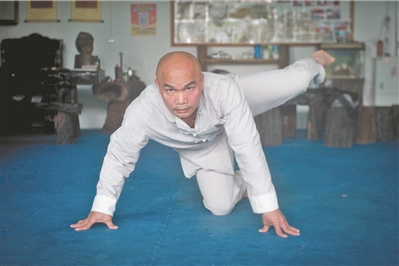 為了追逐自己的功夫夢,黎偉軍在18歲離開家鄉(xiāng)輾轉河南、河北、廣西拜師學武功。“那時練得很苦,每天練功前先跑10公里。”黎偉軍告訴記者。除了跑步,每天500個仰臥起坐、500個俯臥撐和300個引體向上也是意志的考驗。訓練之余還有對練,由于個子小,最初黎偉軍每次和同門師兄弟對抗時都很吃虧,經(jīng)常被打倒。但他不以為然,“首先你不能怕,要有氣勢。狗拳也一樣,看似被打倒其實在醞釀反擊?!睉{著一份堅持,一段時間后黎偉軍反過來把別人打倒了。而且短短數(shù)年時間,他便學會了散打、詠春、截拳道、太極和硬氣功等武功。