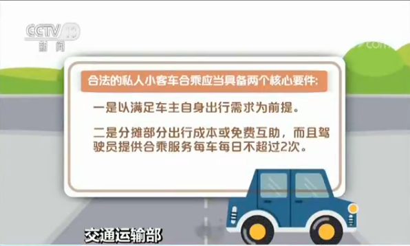 交通運(yùn)輸部表示,合法的私人小客車合乘應(yīng)當(dāng)具備兩個核心要件:一是以滿足車主自身出行需求為前提,二是分?jǐn)偛糠殖鲂谐杀净蛎赓M(fèi)互助,而且駕駛員提供合乘服務(wù)每車每日不超過2次。