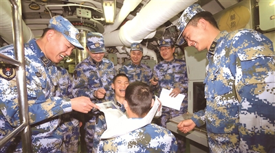 某潛艇支隊(duì)立足“百人同操一桿槍的現(xiàn)實(shí)”,堅(jiān)持踐行群眾路線、密切聯(lián)系官兵。圖為該支隊(duì)某艇員隊(duì)副政委徐建鵬和戰(zhàn)士們一起開展“龍宮游戲”,以緩解深海長(zhǎng)航帶來(lái)的巨大心理壓力,為艇員們保持良好備戰(zhàn)狀態(tài)增添動(dòng)力。茆 琳攝