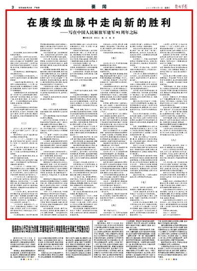 2018,八一。當(dāng)歷史的時(shí)針指向這個(gè)神圣光榮的日子,讓我們回望那光耀千秋的偉大征程,銘記歷史、不忘初心、牢記使命、不懈奮斗,確保人民軍隊(duì)血脈永續(xù)、根基永固、優(yōu)勢永存,不斷書寫強(qiáng)國強(qiáng)軍更為輝煌的篇章!請關(guān)注今日出版的《解放軍報(bào)》的文章——