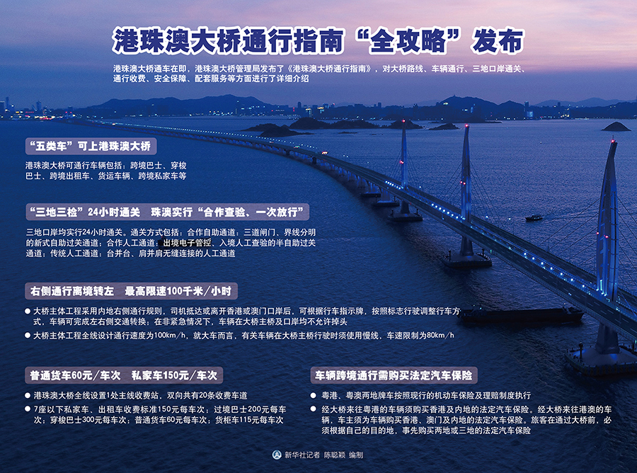 新華社廣州10月21日電(記者 周強)港珠澳大橋通車在即,港珠澳大橋管理局發(fā)布了《港珠澳大橋通行指南》,對大橋路線、車輛通行、三地口岸通關(guān)、通行收費、安全保障、配套服務(wù)等方面進(jìn)行了詳細(xì)介紹。
