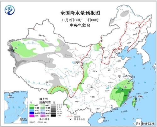 圖4 全國降水量預(yù)報圖(11月2日08時-3日08時)。圖片來源:中央氣象臺網(wǎng)站