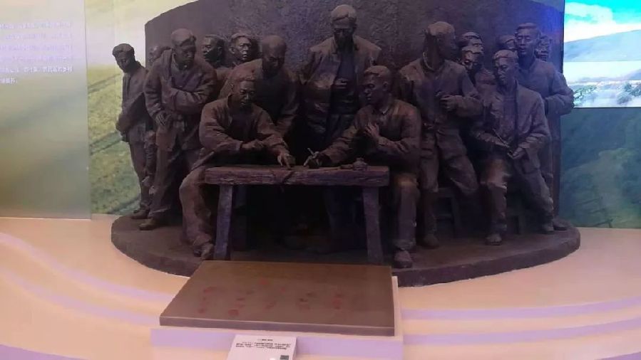 “我們的家鄉(xiāng),在希望的田野上。”1978年冬,安徽鳳陽縣小崗村18位農(nóng)民堅(jiān)定地按下紅手印,實(shí)施包產(chǎn)到戶,拉開了中國農(nóng)村改革的大幕,成為中國改革的標(biāo)志。這座雕塑讓我們重溫那個(gè)永載歷史的瞬間。
