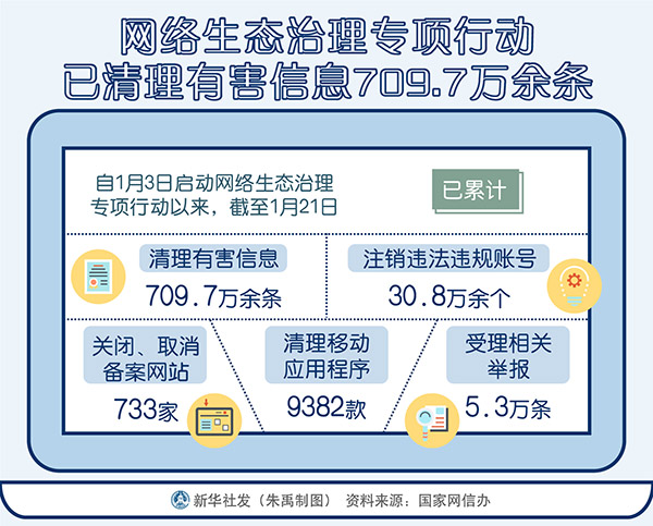 新華社北京1月23日電(記者史競男、白瀛)記者23日從國家網(wǎng)信辦獲悉,自1月3日啟動(dòng)網(wǎng)絡(luò)生態(tài)治理專項(xiàng)行動(dòng)以來,截至1月21日,已累計(jì)清理有害信息709.7萬余條,注銷違法違規(guī)賬號(hào)30.8萬余個(gè),關(guān)閉、取消備案網(wǎng)站733家,清理移動(dòng)應(yīng)用程序9382款,受理相關(guān)舉報(bào)5.3萬條。