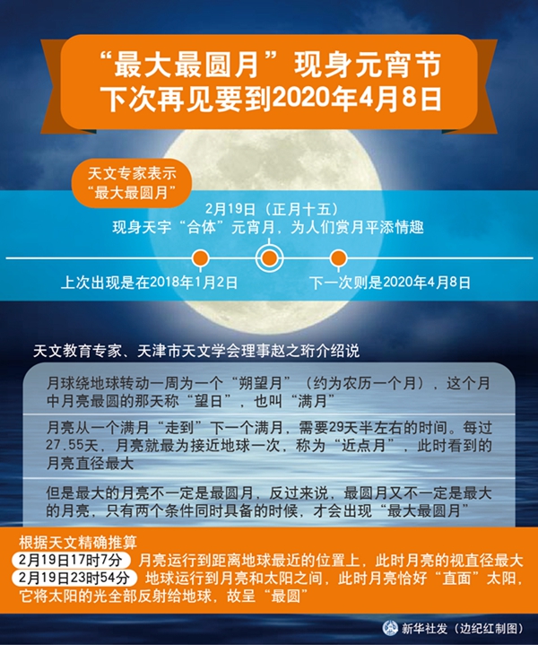 新華社天津2月19日電(記者周潤?。┠甓取白畲笞顖A月”19日(正月十五)現(xiàn)身天宇“合體”元宵月,為人們賞月平添情趣。天文專家表示,“最大最圓月”上次出現(xiàn)是在2018年1月2日,下一次則是2020年4月8日。