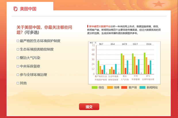綠水青山是你我都關(guān)注的熱點(diǎn)。在新華網(wǎng)推出的2019全國(guó)兩會(huì)熱點(diǎn)調(diào)查中,新華睿思大數(shù)據(jù)通過監(jiān)測(cè)新聞網(wǎng)站、論壇、微信、微博、APP、平媒6個(gè)信源,分析結(jié)果顯示,全國(guó)兩會(huì)開幕以來,關(guān)于生態(tài)環(huán)境的話題共832 4987個(gè)。