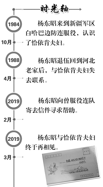隨著時間的推移,楊東昭這個當(dāng)年20歲的小伙子如今已年過半百,雖然日子過得越來越紅火,但內(nèi)心對兩位哈薩克族老人的思念越發(fā)強烈。在千家萬戶團聚歡樂的鞭炮聲中,他提筆寫了一封信寄到曾經(jīng)服役的連隊尋求幫助。