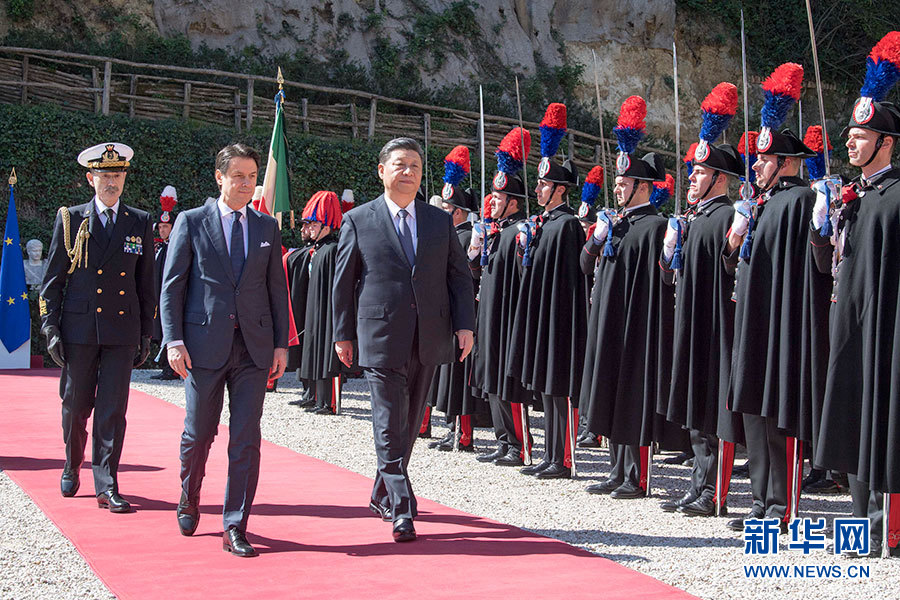 習近平抵達時,孔特總理在停車處迎接。軍樂團奏中意兩國國歌。兩國領導人一同檢閱儀仗隊。