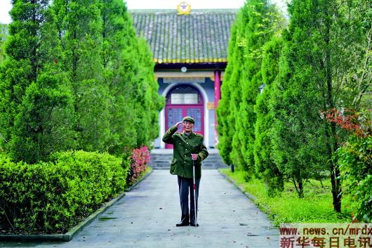 3月27日,程樟柱在紀(jì)念館內(nèi)向前來參觀的游客行軍禮。