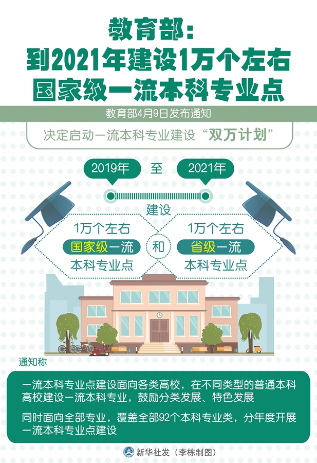 新華社北京4月9日電(記者施雨岑)教育部9日發(fā)布通知,決定啟動(dòng)一流本科專業(yè)建設(shè)“雙萬(wàn)計(jì)劃”,2019年至2021年建設(shè)1萬(wàn)個(gè)左右國(guó)家級(jí)一流本科專業(yè)點(diǎn)和1萬(wàn)個(gè)左右省級(jí)一流本科專業(yè)點(diǎn)。