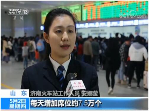 濟(jì)南火車站工作人員 安娜瑩:我們?cè)鲩_列車216趟,320趟動(dòng)車組列車由八節(jié)車廂改為十六節(jié)車廂重聯(lián)運(yùn)行,每天增加席位約7.5萬(wàn)個(gè)。