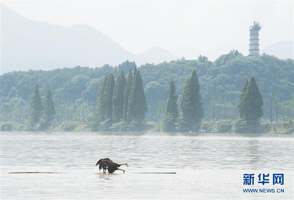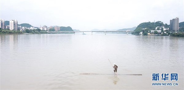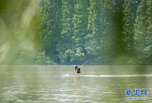 新華社杭州7月11日電(記者商意盈) 江面浩渺,霧氣氤氳。11日上午,浙江新安江上,一根大約8米長的毛竹越江而來,毛竹上站立著一位身穿蓑衣、頭戴斗笠的精瘦男子。他用手中的細(xì)竹竿作槳,輕輕劃水,不多時(shí),人已到江心。