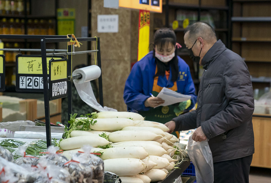 1月28日,在南昌市紅谷灘新區(qū)一家超市,市民在選購(gòu)蔬菜。近日,江西各地加大價(jià)格監(jiān)測(cè)和執(zhí)法檢查力度,著力維護(hù)市場(chǎng)價(jià)格穩(wěn)定。目前,全省重點(diǎn)生活必需品貨源充足,市場(chǎng)供應(yīng)有保障,價(jià)格總體穩(wěn)定。新華社記者彭昭之?dāng)z