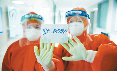 在湖北省十堰市鄖陽(yáng)區(qū)人民醫(yī)院感染科,28歲的護(hù)士焦嬌堅(jiān)守在隔離病區(qū),偶爾才能與3歲的女兒視頻通話(huà)。圖為焦嬌(左)與同事將寫(xiě)有“寶貝,媽媽想你”的紙條貼在玻璃上。周家山攝(人民視覺(jué))