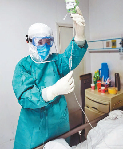 中山大學(xué)孫逸仙紀(jì)念醫(yī)院呼吸內(nèi)科二區(qū)“90后”護(hù)師袁漢珍,與同事一起馳援武漢市漢口醫(yī)院,堅(jiān)守病患救治一線(xiàn)。圖為袁漢珍正在為病人輸液。鮮 敢 張 陽(yáng)攝影報(bào)道