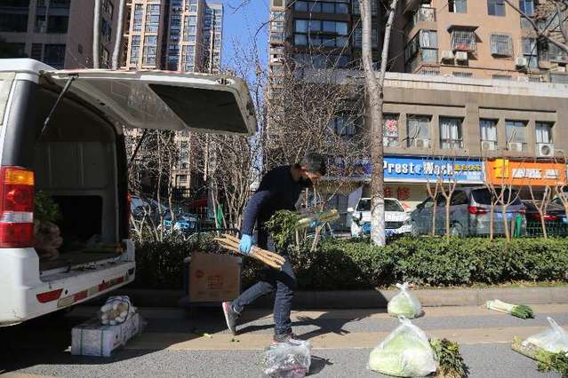 2月16日,湖北省武漢市,送菜小哥許可(中)在卸貨。中青報(bào)·中青網(wǎng)記者 趙迪攝